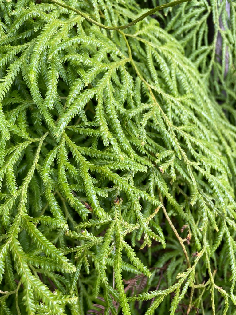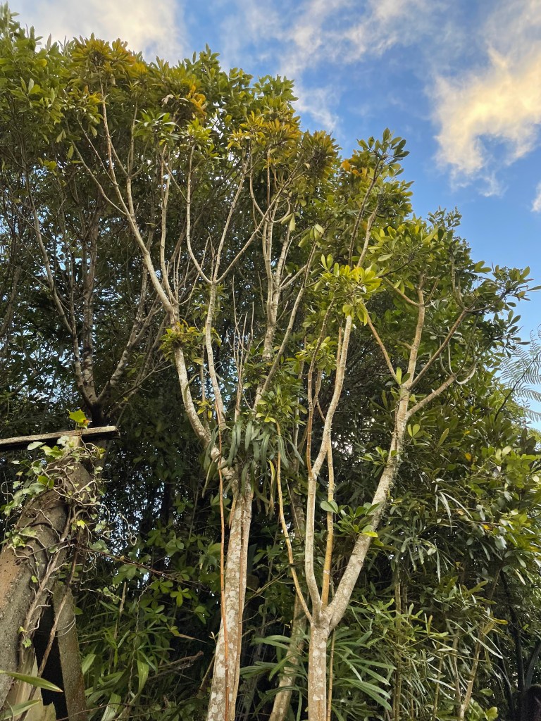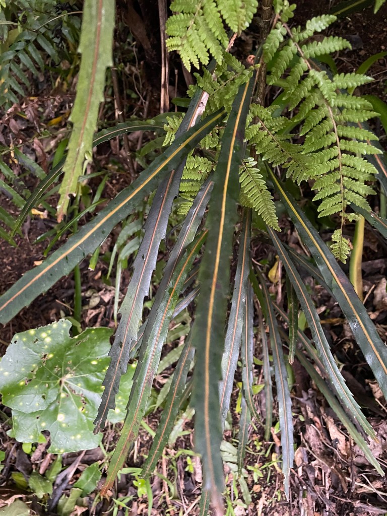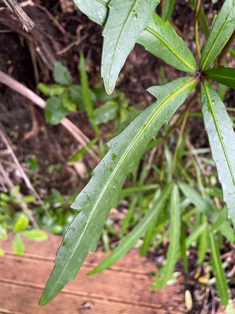 I’m enjoying roaming around the garden and pointing the PlantNet app at things. One small shrub I liked had slim jagged leaves with a median stripe. I was also curious about the tall bushy-topped trees that tower over the left-hand side of the house. Today I found out that these two were actually the same species: lancewood/horoeka (pseudopanax crassifolius). They look so different! I learnt that having wild contrasts like this between juvenile and adult plants is called “heteroblasty“.