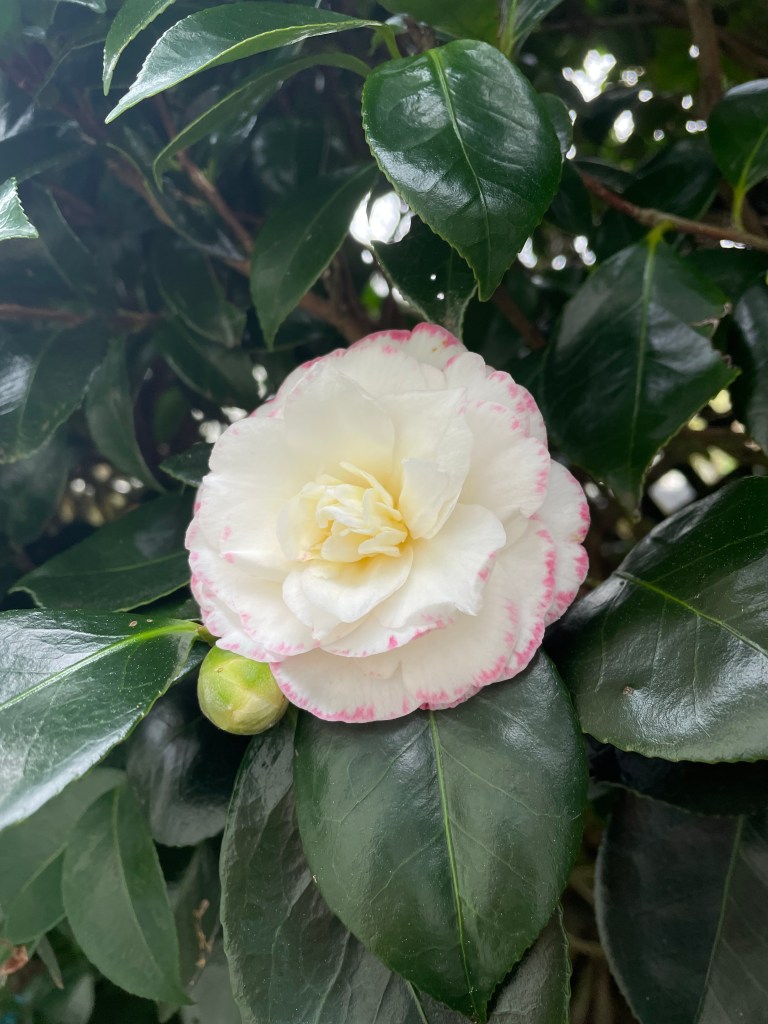 The first to flower ahead of spring are our camellia japonica. We have six trees in a row, which I think are the Margaret Davis variety. The flowers are white with dark pink edges. The colours remind me of the pink-swirled disc you’re served in a satisfying bowl of ramen (narutomaki).