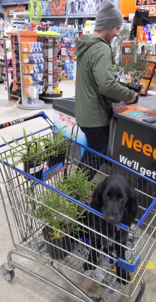 With the first stretch of agapanthus defeated, the dog came for a trolley ride around the garden centre. To start off the bare bank, we selected a pair of “Dragon’s Gold” kōwhai, some pratia pedunculata “Alba” for ground cover, and a couple of blechnum fluviatile ferns. I dug some compost into the leaden clay soil. The bank didn’t collapse, but perhaps a half-arsed line of rocks isn’t a good way to retain it.