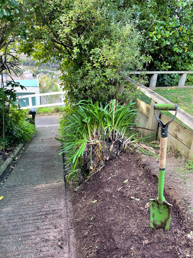 The next strip of path-side agapanthus is proving formidable. Their sliced roots look like halved coconuts. We have a couple of mānuka ready to go in when I’m finished, but to get to that point, the trench spade might need to be swapped for an axe or a flamethrower.