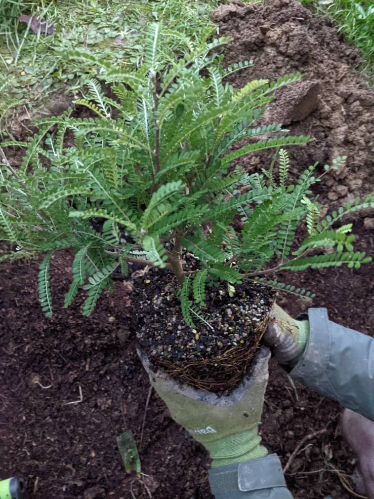 After raking the root remnants, we planted two ‘Snow Flurry‘ mānuka/tea tree (leptospermum scoparium). They’re often chosen for making honey, but with a pair of trees sadly we may only sustain one bee. We chose it for its ability to thrive in dubious soil, and the clay here looked pretty intent on ruining anything I planted. Go, little mānuka, go.