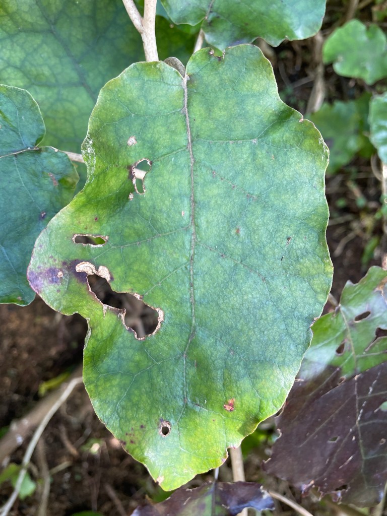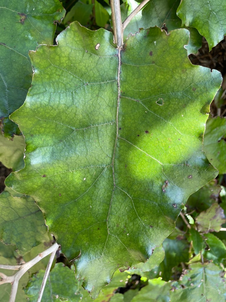 There’s a small tree with big marbled leaves on our jungly bank, which I’ve learnt is the NZ native rangiora (Brachyglottis repanda).